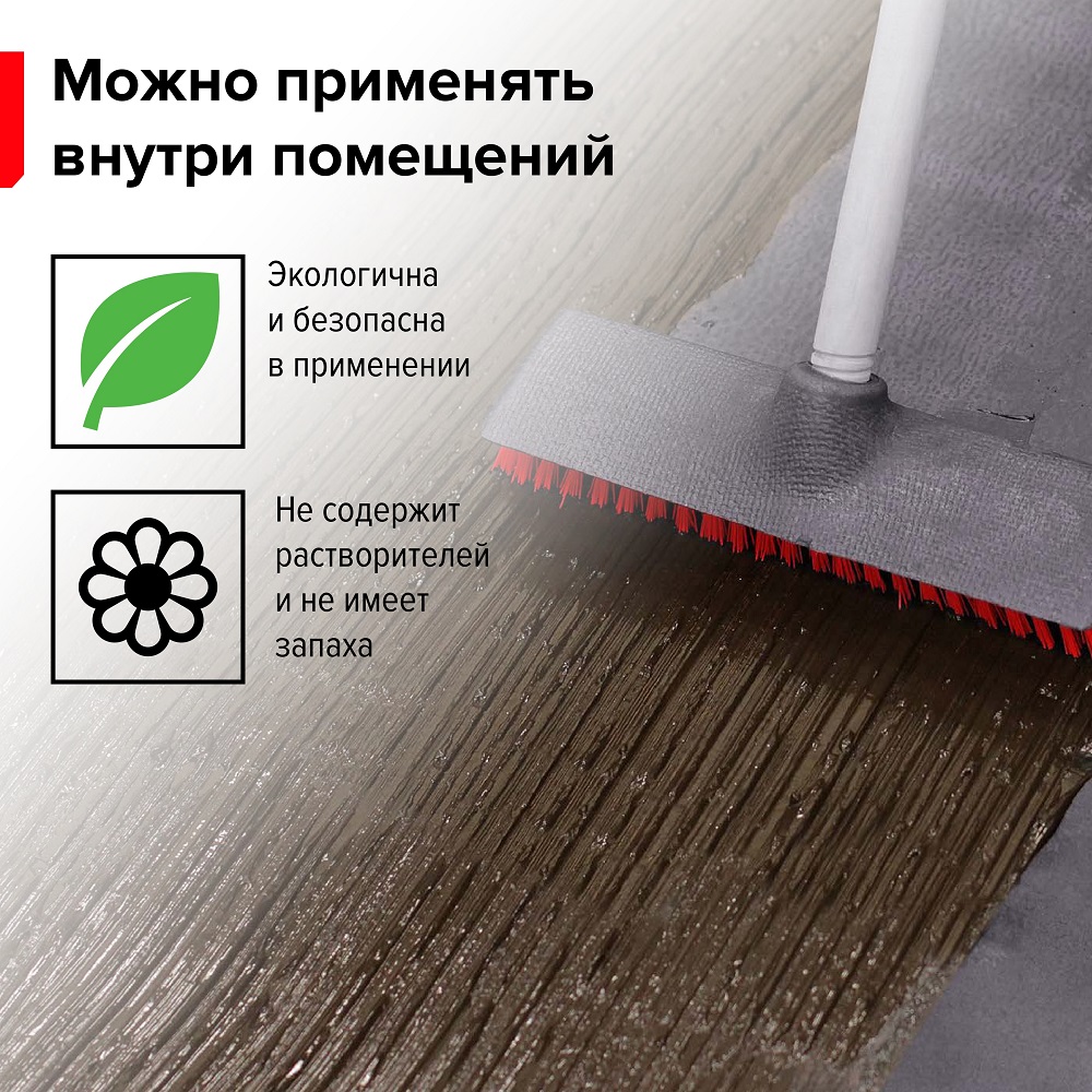 Мастика не содержит растворителей и не имеет запаха, что делает её безопасной и экологичной в использовании. Наносить её можно с помощью кисти или шпателя, не требуя специальных навыков.